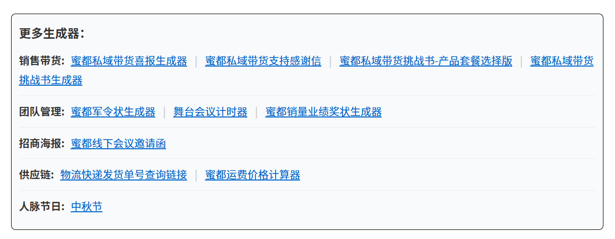 首页 F方法教程 正文 F方法教程 蜜都常用在线工具 — 提升效率事半功倍 2025-09-14 309 分享 什么都懂一点点的猫哥,给大家开发了几个小工具,帮助蜜都小伙伴搞大钱! 蜜都海报生成器 https://d.midou99.cn/ 生成海报 点赞 0 分享