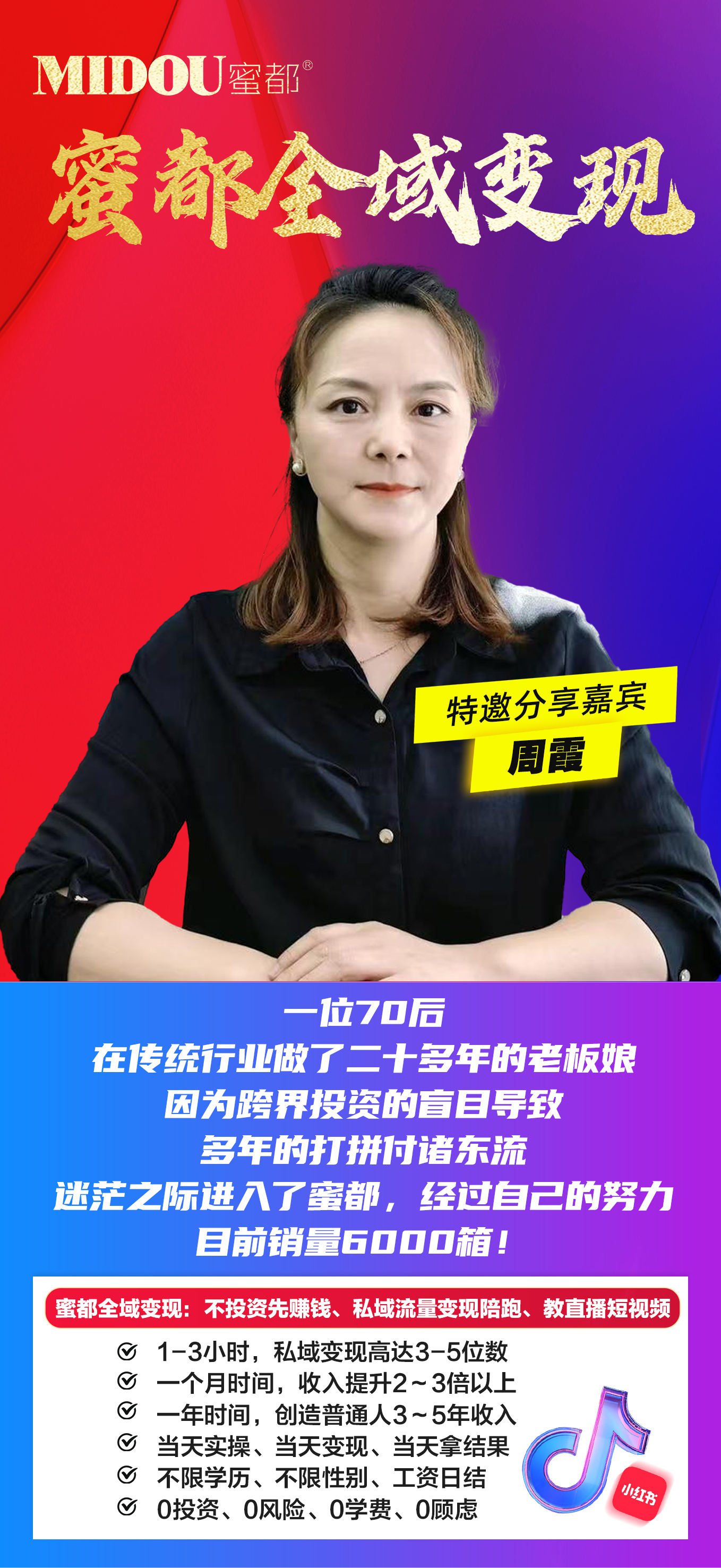 蜜都晨会251225-周霞-一位70后,在传统行业做了二十多年的老板娘,因为跨界投资的盲目导致多年的打拼付诸东流,迷茫之际进入了蜜都,经过自己的努力,目前销量6000箱!