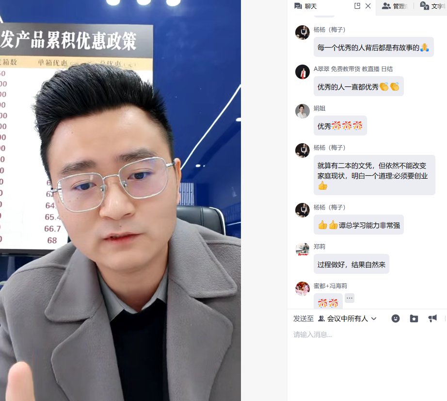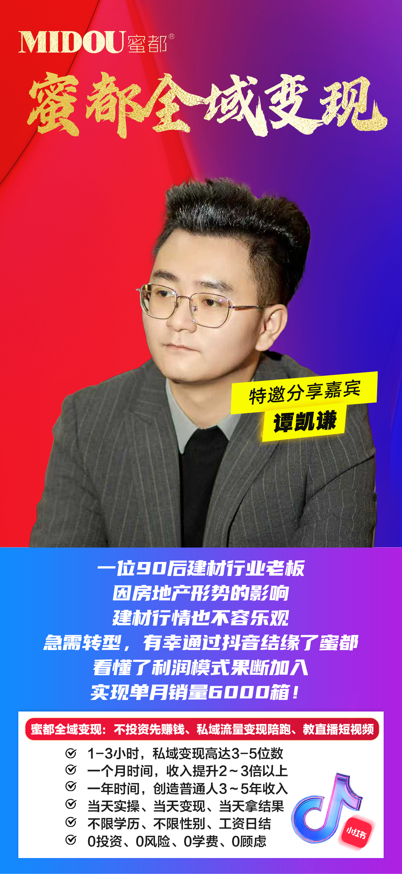 🌹嘉宾简介:大家好,我是谭凯谦,今年32岁,来自于四川成都,我在做蜜都之前,是在成都做家装建材业务!23年建材行业行情也急剧下滑,我的建材业务量也大幅减少,收入也锐角,导致我非常焦虑,意识发展副业增收是当务之急,所以23年过年前,还兼职跑了一个月网约车,每天起早贪黑,结果一个月跑下来纯利润不到4000块钱!正当我绞尽脑汁,寻找出路的时候,好运来了,在2024年3月10号,我刷抖音,刷到一个账号,里面视频宣传了很多人不花一分钱当天带货赚钱的案例,急需赚钱的我,抱着疑惑,当天下午就到了运营中心,了解并尝试了第一场私域带货,蜜都不花钱先赚钱的运营理念,深深吸引了我,而且我的私域粘性并不高,都能变现,我意识到这个业务,市场一定不小,是个大生意,因为人人都有一个私域圈子,市场最不缺的就是人,特别是想赚钱的人,于是我开始尝试学习做引流!